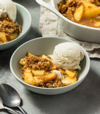 - Faites cuire 25 à 30 min dans un four préchauffé à 180°C, jusqu’à ce que le crumble soit bien doré.