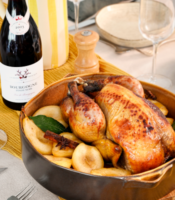 Au verre, on opte pour le vin de France Reine Pedauque, un Pinot Noir de Bourgogne aux notes de petits fruits rouges. Les tanins sont riches en bouche et se mêlent à des arômes épicés, presque grillés.