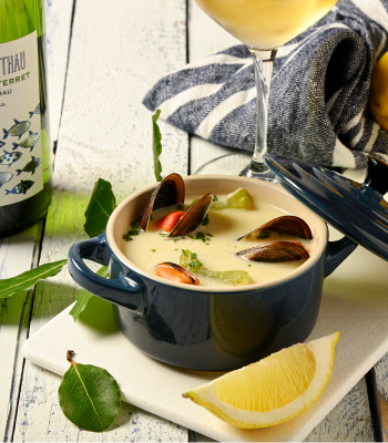 Avec cette soupe de la mer, le verre de vin blanc n’est jamais loin ! On vous conseille l’IGP(2) Cotes de Thau Bleu Blanc Thau, un vin frais et équilibré aux notes de pamplemousse et de citron :